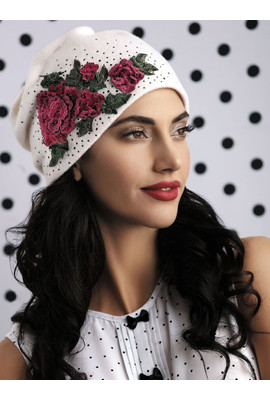 Шапка женская (DRACENA) Элегантная модная шапка-бандана с мягкой драпировкой складок и фигурными защипами сзади. Украшена россыпью мелких черных страз по полю шапки и яркой двухцветной аппликацией «розы», вышитой гладью, шелковыми нитями и усеянной мел...