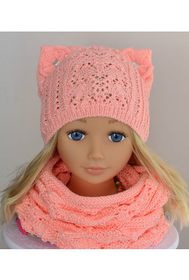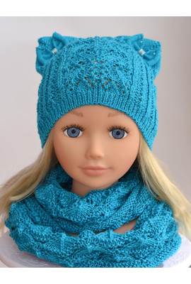 Ажурная шапочка для девочек от 3 лет (большой размер) и на возраст 1-3 года (маленький размер). Выполнена из красивой пряжи, которая блестит на солнце. Отделка ― кошачьи ушки с бантиками и стразами. Шарф ажурной вязки, надевается как двойное кольцо. Со...
