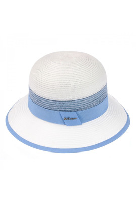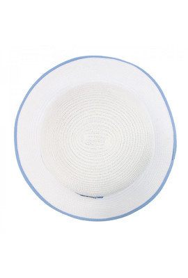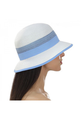 Женская шляпа Del Mare Модель: 103 Цвет: 02.03 Состав: cotton, capron,cotton,polyester Ширина поля: 6 см. Диаметр шляпы: 30 см. Высота тульи: 10 см. Размер: 56-58 Цвет основной: белый. Цвет дополнительный: голубой. Аксессуар: лента.