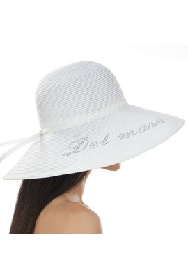 Женская шляпа Del Mare Модель: 135 Цвет: 02 Состав: capron, polyester Ширина поля: 13,5 см. Диаметр шляпы: 42 см. Высота тульи: 10 см. Размер: 56-58 Цвет основной: белый. Цвет дополнительный: нет. Аксессуар: лента в тон, отделка стразами. Детали: пласт...