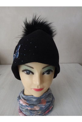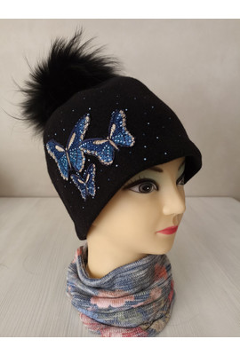 Шапка с натуральным помпоном "Модеста" 018 чёрный (бабочки голубые) - Интернет-магазин - ELENKA
