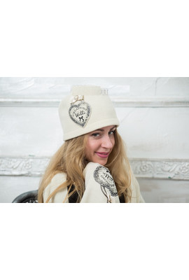 Элегантный комплект из женской шапки и шарфа. Головной убор выполнен из натуральной шерсти, шарф из 50% шерсти и 50% акрила. Изделия декорированы атласными бантиками, стразами и принтом с логотипом фирмы, имитирующим ювелирное изделие. Состав: 100% шер...