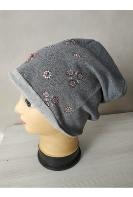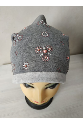 Стильная женская шапка с руликом по краю шапки. Выполнена из утепленного хлопкового трикотажного полотна. Украшена декоративными композициями из страз двух цветов, жемчугом, металлической шильдой и пуговоцей на макушке.