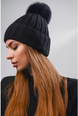 ШАПКА С ОТВОРОТОМ И МЕХОВЫМ БУБОНОМ - 26816-8 чёрный