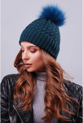 Стильная женская шапка с отворотом, изготовленная из мягкой и приятной пряжи с пышным пампоном из натурального меха песца, покрашенного в цвет шапки. Изделие со сложными элементами вязки. Станет прекрасным дополнением к пуховику, пальто или шубке, согревая в прохладную погоду.