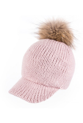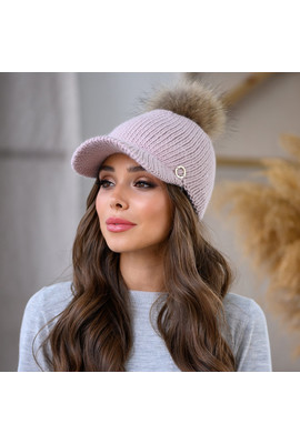 МОДНАЯ ВЯЗАНАЯ КЕПКА С НАТУРАЛЬНЫМ МЕХОВЫМ ПОМПОНОМ "АВГУСТА" - 422-034 пудра