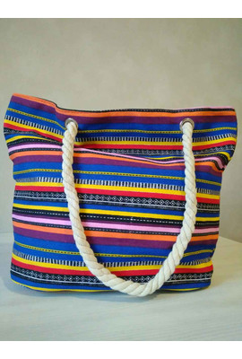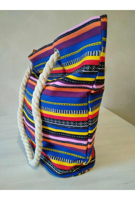 Сумка пляжная выполнена из плотной льняной ткани с  цветным рисунком. Ручки изготовлены из мягких канатов. На подкладке . Закрывается на молнию. Канатные ручки продеты в металлические кольца, что придаёт сумке стильный вид. Легкая, очень удобна в носке...