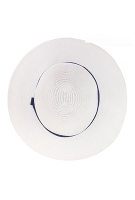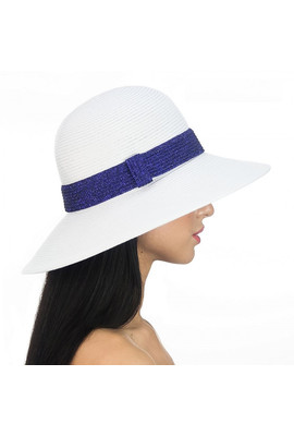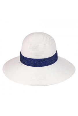 Женская шляпа Del Mare Модель: 155 Цвет: 02.05 Состав: capron, polyester Ширина поля: 10 см. Диаметр шляпы: 37 см. Высота тульи: 10 см. Размер: 56-58 Цвет основной: белый. Цвет дополнительный: синий. Аксессуар: лента с добавлением люрекса.