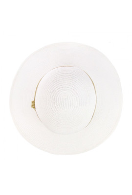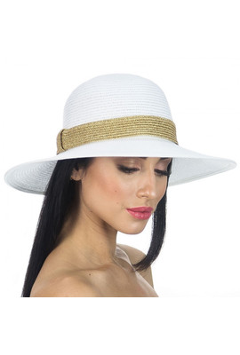 Женская шляпа Del Mare Модель: 155 Цвет: 02.43 Состав: capron, polyester Ширина поля: 10 см. Диаметр шляпы: 37 см. Высота тульи: 10 см. Размер: 56-58 Цвет основной: белый. Цвет дополнительный: золото. Аксессуар: лента с добавлением люрекса.