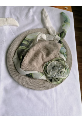 • Шляпка вязаная из 100% ХБ. Маленькое поле. Оригинальное украшение в виде цветка и пояска из шифона. Подходит на любой размер. Цвета разные.