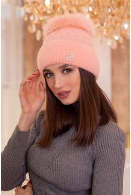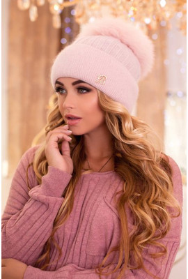 Небольшой металлический брендовый логотип со стразами Swarovski расположился на отвороте шириной в 9 см. Эта модель представлена в нежнейших пастельных тонах. Ангоровые шапки сочетаются со многими образами.