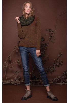 Женский шарф-снуд с перекрутом. Изделие выполнено из смеси шерсти и акрила. Модель декорирована меланжевым эффектом. Будет хорошо дополнять образ и согревать от холодной погоды.