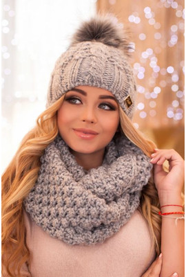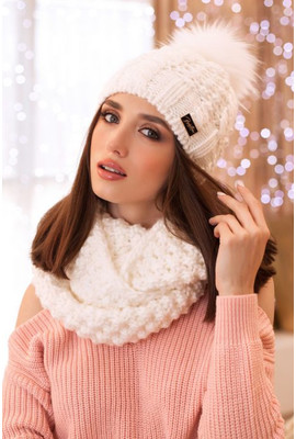 • Роскошный комплект «Сара» оценят любительницы теплых и оригинальных изделий. В состав пряжи входит шерсть, что является не мало важным для зимнего аксессуара. Связан комплект крупной и узорной вязкой, именно поэтому выглядит очень стильно и объемно. Данный набор состоит из шапки и шарфа-снуда. Головной убор утеплен мягкой флисовой подкладкой. В качестве декорации используется металлический брендовый логотип с камнями Swarovski. Полотно связано достаточно широким – 29 см, тем самым позволяя разнообразить способы ношения и варианты укладки вокруг шеи. Этот комплект подчеркнет утонченный образ и подарит нежное тепло, что кстати очень к месту в холодные зимние дни.