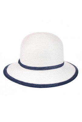 Женская шляпа Del Mare Модель: 152 Цвет: 02.05 Состав: capron, polyester Ширина поля: 7 см. Диаметр шляпы: 29,5 см. Высота тульи: 10 см. Размер: 56-59 Цвет основной: белый. Цвет дополнительный: синий. Аксессуар: лента из тесьмы в тон. Детали: моделируе...
