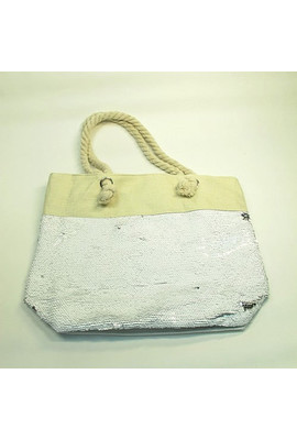 • Модная летняя сумка с пайетками "рыбья чешуя". Верхняя и задняя часть изделия выполнена из льна. Ручки изготовлены из декоративного каната. Сумка закрывается на молнию.