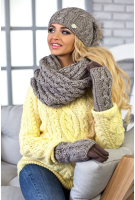 • Необычный женский комплект на основе толстой узорной вязки «Афина» смотрится модно и неповторимо. Головной убор одинарный с бубоном из натурального енота и с флисовой подкладкой, которая хорошо сохраняет тепло в холодное время года. Также в состав данного вязаного комплекта входят перчатки и шарф-снуд. На шапке присутствует украшение в виде логотипа торговой марки производителя со стразами.