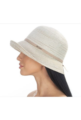 Женская шляпа Del Mare Модель: 184 Цвет: 32.30 Ширина поля: 8,5-5 см. Диаметр шляпы: 29 см. Высота тульи: 10 см. Размер: 56-58 Цвет основной: бежевый. Аксессуар: лента. Детали: пластиковый каркас.