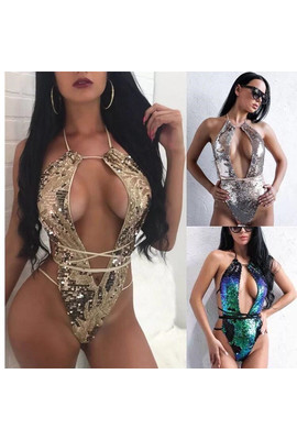 Пикантный сдельный купальник в паетках. Завязывается на шее, спинка на шнуровке и открытая. Наличие цветов и размеров уточняйте.