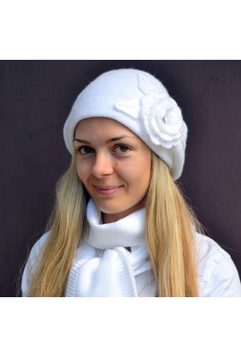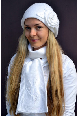 Женский берет из теплой, мягкой пряжи. Вязка плотная, подходит на позднюю осень/зиму. Отделка: большой вязаный цветок. Под берет можно подобрать шарфик, а также рукавички-митенки. Цвет: белый. Размеры: 55, 56, 57.