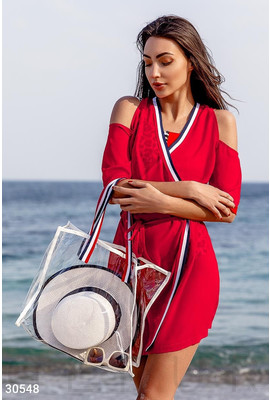 • Невесомая пляжная туника на запа́х, с контрастной окантовкой, небольшими разрезами на плечах и коротким рукавом, дополненная вместительной прозрачной сумкой.