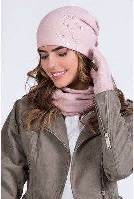 • ZIRA - стильная женственная шапка, украшенная аппликациями в виде стрекоз. Сзади крепится защипами.