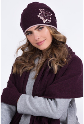 ЖЕНСКАЯ ШЕРСТЯНАЯ ШАПКА С КРАСИВЫМ ЦВЕТКОМ НА БОКУ "ПАНАМА" + шарф (PANAMA) - 20.042.14 тёмная слива