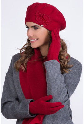 Одноцветный, двойной шерстяной женский берет из Польши по доступной цене. Главное его украшение - аппликация в виде листа, украшенная бусинами.