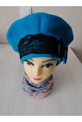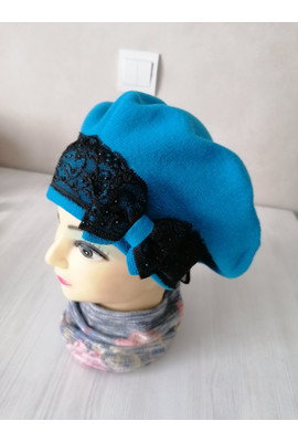 Одинарный берет из тонкой пряжи, украшен бантом из основной пряжи и кружевом со стразами.