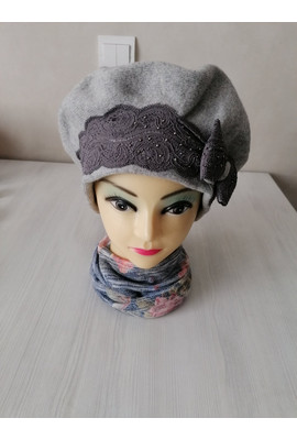 Берет женский (EMANUELA) Одинарный берет из тонкой пряжи, украшен бантом из основной пряжи и кружевом со стразами. Страна производитель: Польша Фирма производитель: KAMEA Состав: 90% шерсть, 10% полиамид Размер: 56-59