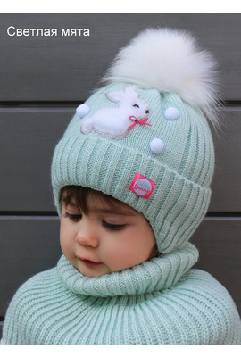 Шапка зимняя для девочек с отворотом, ушками, на завязках Зайчик (1-2 года) - 052 мята
