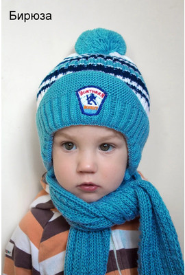 Зимняя шапка для мальчиков 1-2,5 лет (р. 45-49) с ушками и завязками "Хоккей"- 063 бирюза