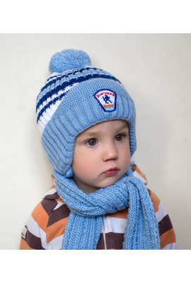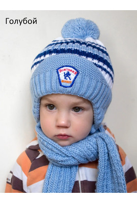 Зимняя шапка для мальчиков 1-2,5 лет (р. 45-49) с ушками и завязками "Хоккей"- 063 голубой