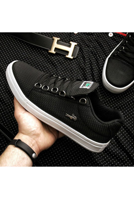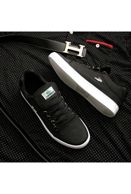 Трендовые качественные мужские кеды из прорезиненной кожи Lacoste - 3984 черно-белые