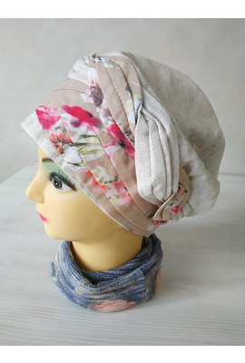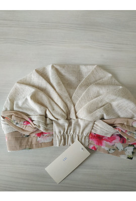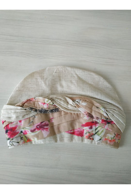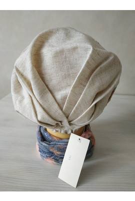 Оригинальная летняя бандана-чалма выполнена из льна с вставками из коттона. Сзади в области затылка вшита резинка для более комфортной посадки изделия на голове.