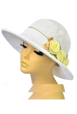 Модная летняя шляпа из натурального льна декорированная красивыми шифоновыми цветами сбоку. Легкая и очень комфортная шляпка уже давно полюбилась многим покупательницам и остается хитом продаж уже много сезонов подряд.