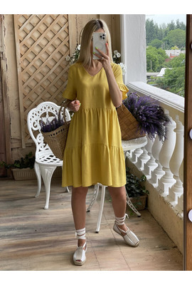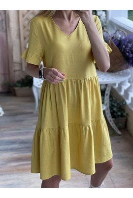 Ткань: лён Размер: 42, 44, 46, 48, 50, 52. Цвет: жёлтый. Платье свободного кроя, карманы в боковых швах.