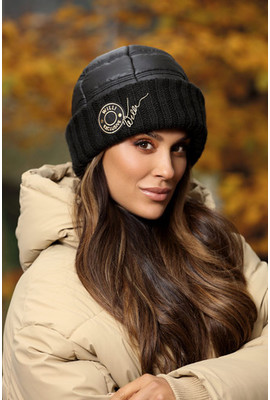 Стильная шапка в черном цвете с широким отворотом, который украшен логотипами. Основа шапки из экокожи. Фирма производитель: Willi. Страна производитель: Польша. Размер: 56-59. Состав: 100% валяная шерсть.