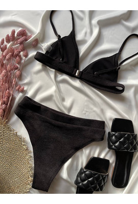 Лиф с классической треугольной чашкой на широком поясе со съемными чашечками. Есть регуляторы. Плавки с завышенной посадкой с открытыми бедрами, на подкладе.