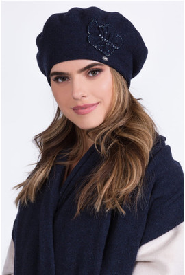 Одноцветный, двойной шерстяной женский берет из Польши по доступной цене. Главное его украшение - аппликация в виде листа, украшенная бусинами.