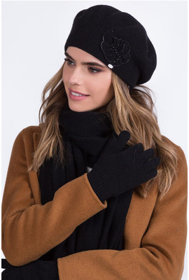 Одноцветный, двойной шерстяной женский берет из Польши по доступной цене. Главное его украшение - аппликация в виде листа, украшенная бусинами.