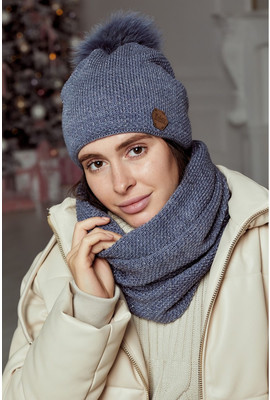 Комплект двойка с люрексом. Шапочка двойная с натуральным бубоном песец. Снуд бафф.