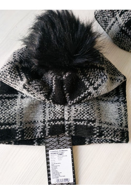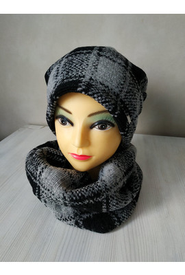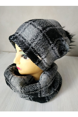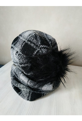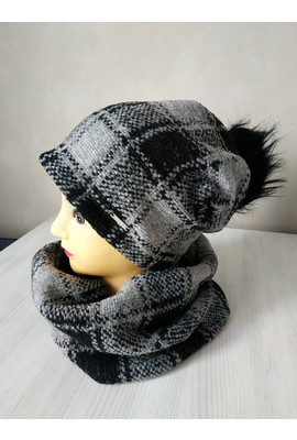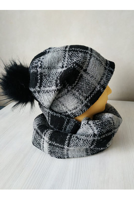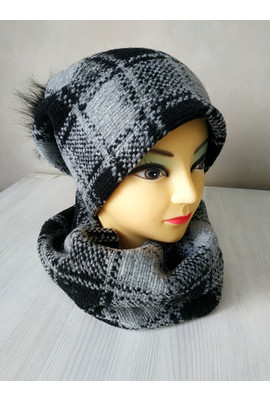 • Женский комплект в клетку: шапка с помпоном из искусственного меха на хлопковой подкладке, хомут также на хлопковой подкладке.