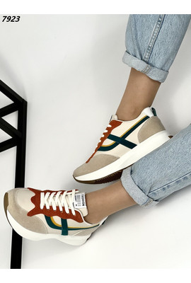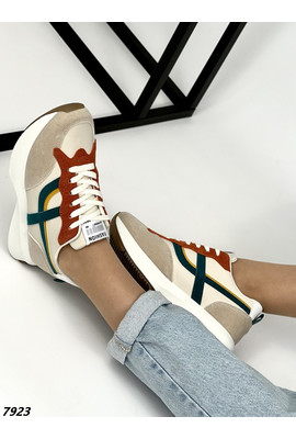 Код 7923 Кросівки Матеріал еко-замша + еко-шкіра Колір Beige/Orange На шнурівці Висота від п'яти 7,5 см Висота підошви 4 см Розмірна сітка: 36 - 23,5 см 37 - 24,0 см 38 - 24.5 см 39 - 25,0 см 40 - 25,5 см 41 - 26,0 см