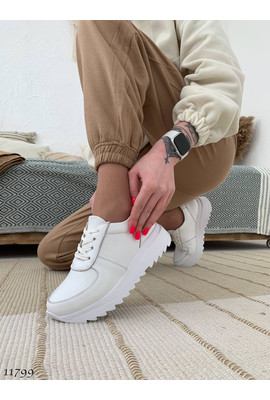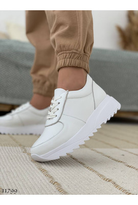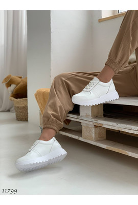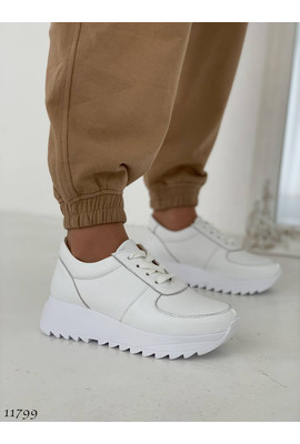 Код 11799 Кросівки колір: WHITE матеріал: НАТУР.ШКІРА всередині: шкірпідклад висота від п'яти 7,5 см підошва: спереду 2,5 см позаду 4.5 см. Виробник -Україна 36= 23,5 см 37= 24 см 38= 25 см 39= 25,5 см 40 = 26 см