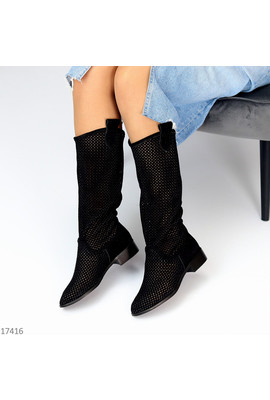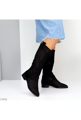 Код 17416 Розміри 36-40 Чоботи літні "Sunflower" Матеріал - Екозамша Устілка - Екошкіра Колір - Чорний Висота від п’ятки - 33см Підошва - 3см/1см Виробник - Туреччина На середню та більш вузьку стопу Маломірять 36-23 37-23,5 38-24 39-25 40-25,5.