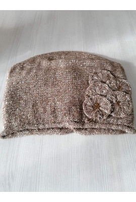 Шапка с внутренним отворотом из меланжевой пряжи с пайетками. Украшена цветами ажурной вязки из основной пряжи с бисером.