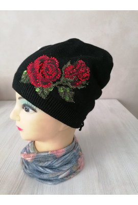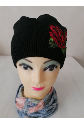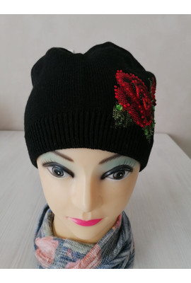 Шапка-бандана женская Двойная шапка-бандана из тонкой пряжи, с регулировкой по высоте. Украшена цветами из флока с бисером. Страна производитель: Польша Фирма производитель: KAMEA Состав: 70% шерсть, 30% акрил Размер: 56-59.