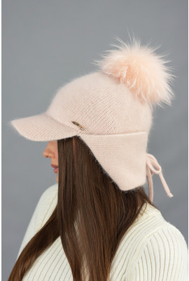 Главная страница Женские шапки Осень-Зима Женская вязаная ушанка с козырьком и бубоном "Альба" 7235-1 светлая пудра