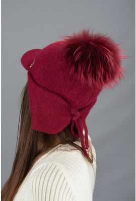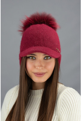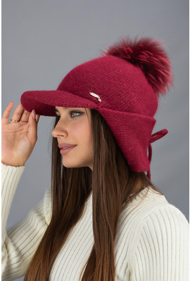 Женская вязаная ушанка с козырьком и бубоном "Альба" 7235-1 бордовая