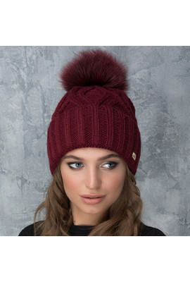 Изображения Бордовая женская шапка Гламур с натуральным помпоном - Интернет-магазин - ELENKA